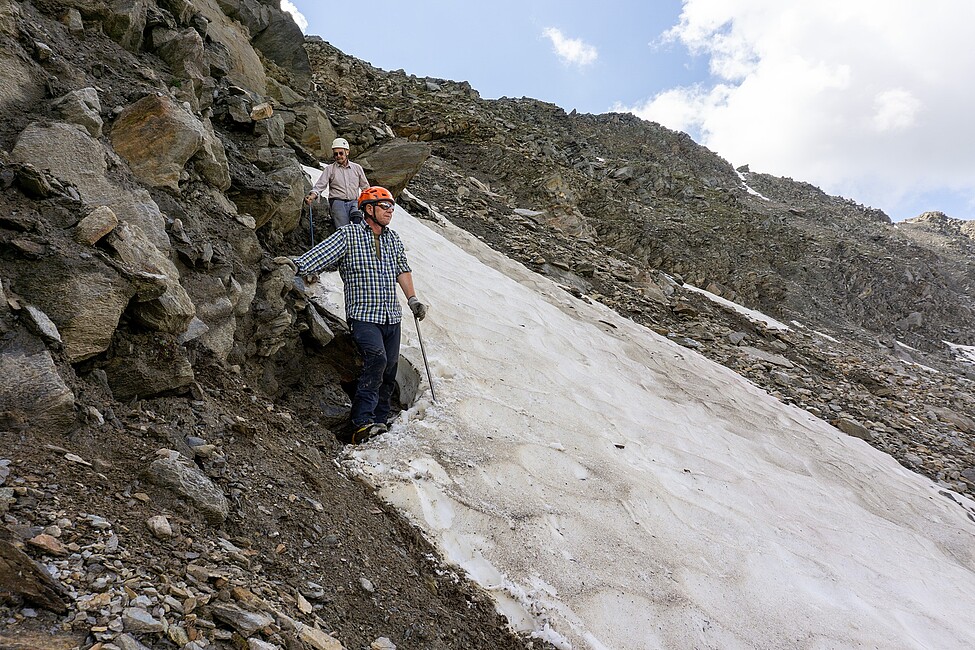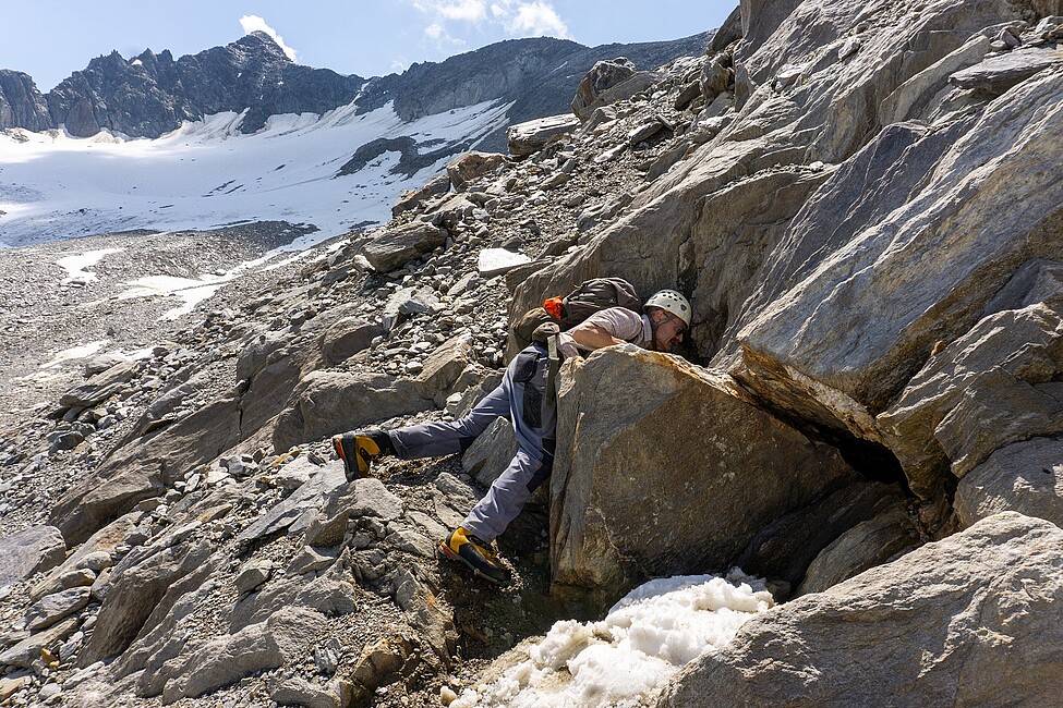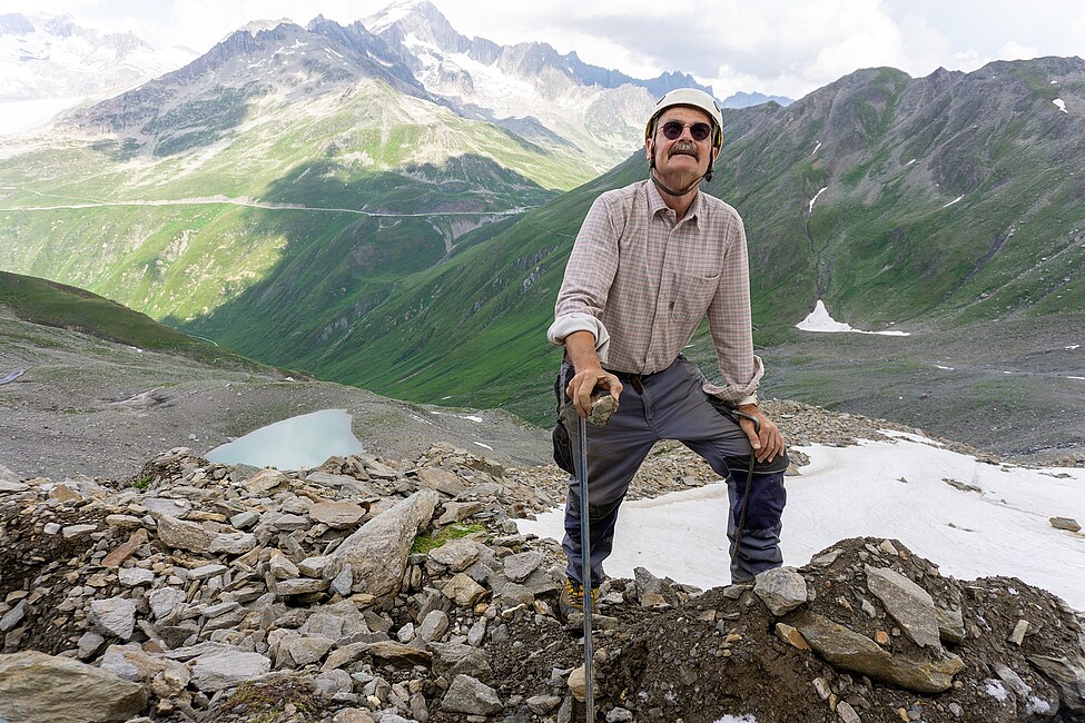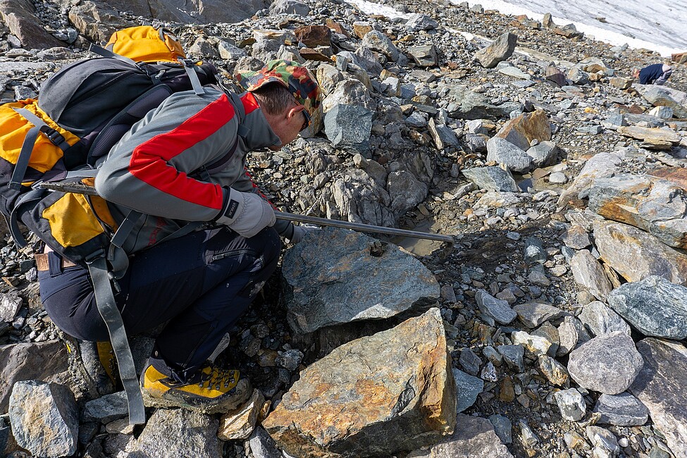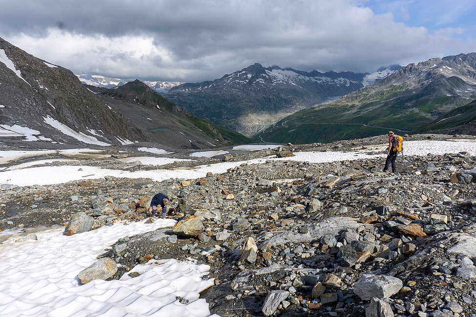 Auf dem Furkapass angekommen, holen die beiden ihre Materialien aus dem Kofferraum: Bergschuhe, Strahlstöcke und schwere Rucksäcke mit Handschuhen, Helm, Hammer, Meissel und Beutel mit Luftpolsterfolie für allfällige Fundstücke. Zunächst gehen sie den Wanderweg entlang; am Hang hört man die Murmeltiere pfeifen, und trotz hochsommerlicher Temperaturen im Flachland braucht es eine Jacke. Schon bald verlassen sie den Wanderweg und steigen den Geröllhang empor – immer auf der Suche nach Anzeichen.