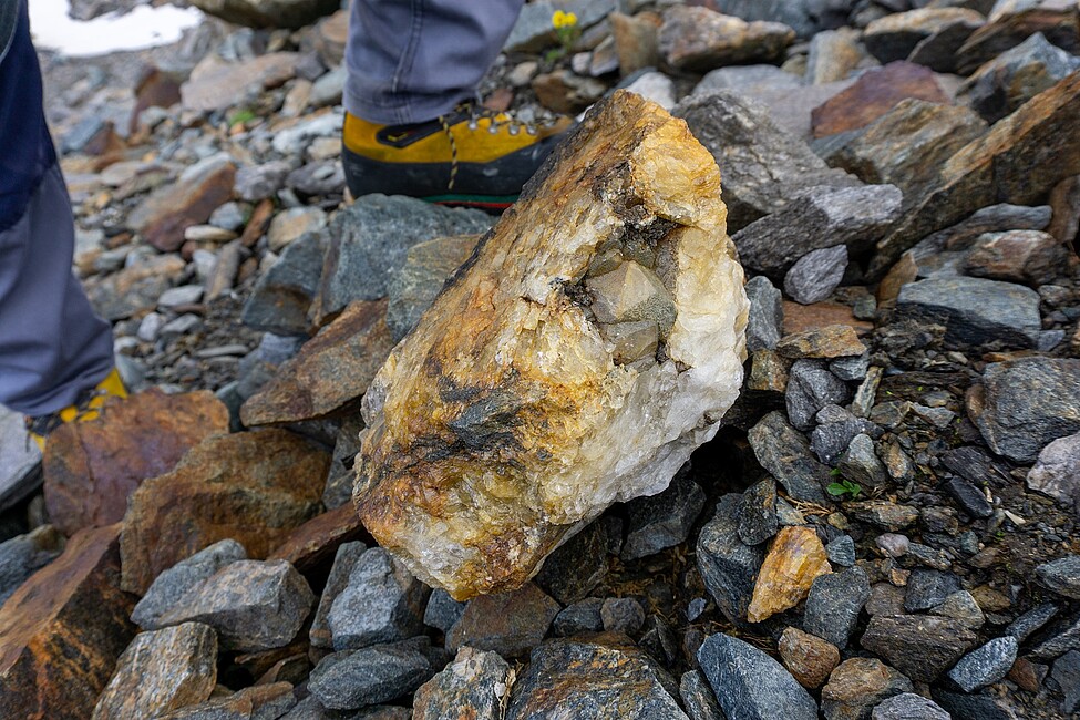 Wie wichtig dies sein kann, zeigt eine Situation kurze Zeit später. Peter Perren hat am Hang eine lose, durch Limonit leicht gelb gefärbte schöne Einzelspitze gefunden. Diese muss aus dem Gestein oberhalb der Fundstelle stammen, dort ist eine ähnliche Färbung erkennbar. Der Aufstieg dorthin gestaltet sich jedoch nicht ganz einfach; das Gestein ist eher lose, darunter geht es mehrere Meter in die Tiefe. Und oben zeigt sich: Um bis zum anvisierten Felsen vorzudringen, wäre eine nicht ganz ungefährliche Kletterpartie notwendig. Während es Peter Perren offensichtlich in den Fingern juckt, diese zu wagen, gibt sich Heinz Scheiber zurückhaltender. Und nach kurzer Diskussion ist es entschieden: Sie lassen es bleiben. Kurz darauf beginnen sie den Abstieg – und ein vorbeirennendes, ziemlich wohlgenährtes Murmeltier bildet den perfekten Abschluss eines herrlichen Tages mit sonnigem Wetter, guter Gesellschaft und einem schönen Fund.