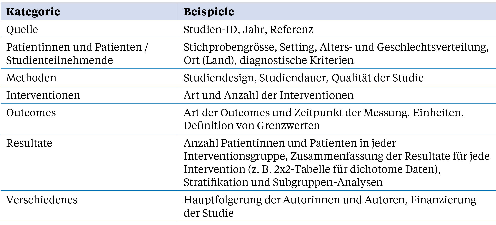 Es lohnt sich, während der Lektüre der Artikel eine Datenextraktionstabelle anzulegen, in der alle relevanten Punkte jedes Artikels festgehalten werden. Eine Auswahl möglicher Datenpunkte findet sich in der folgenden Tabelle.