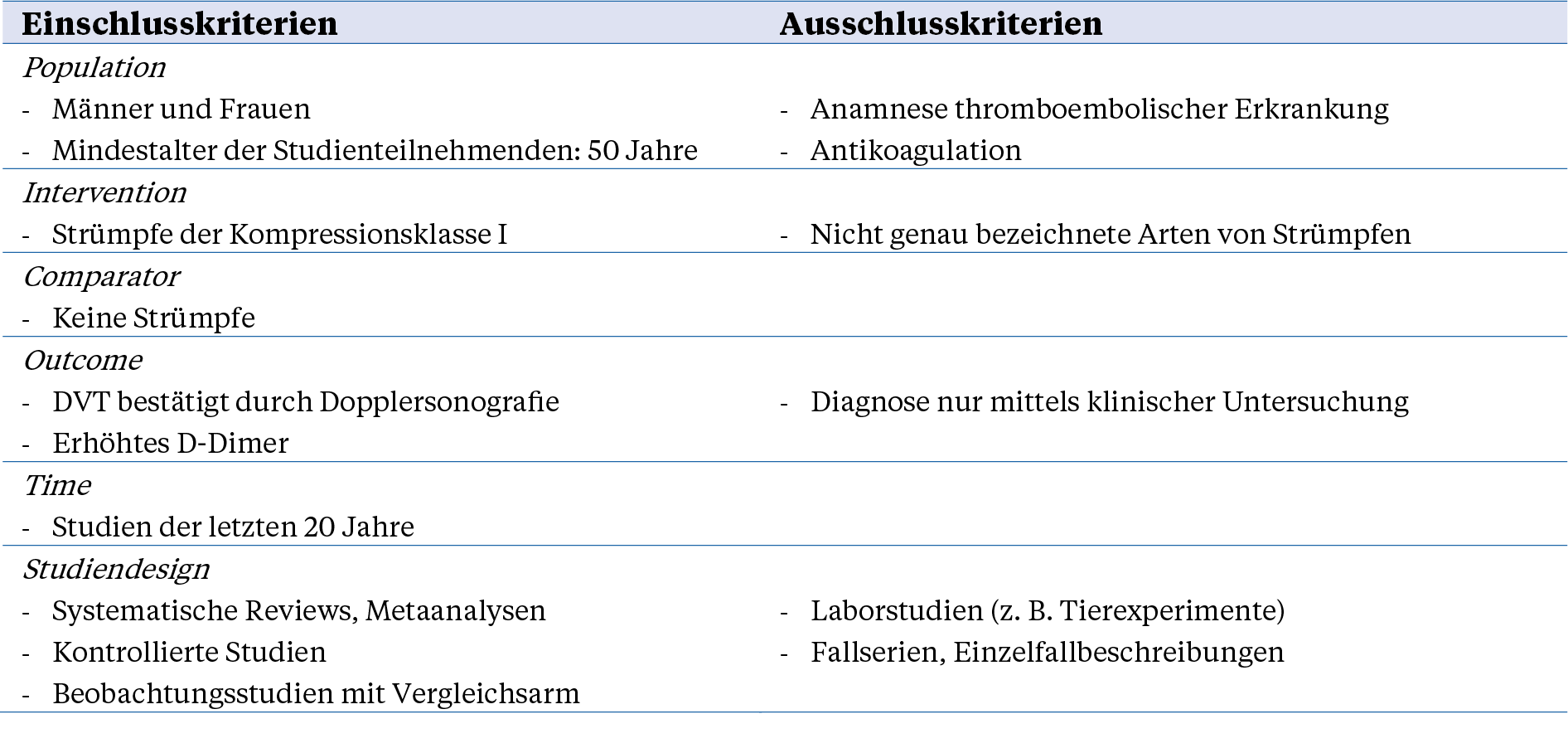 Nehmen wir an, Sie möchten eine Studie durchführen, die die Wirksamkeit von Kompressionsstrümpfen zur Prävention von Beinvenenthrombosen auf Langstreckenflügen ermittelt. Dann könnten Sie folgende Auswahlkriterien für Ihre Suche definieren (die Liste erhebt keinen Anspruch auf Vollständigkeit):
