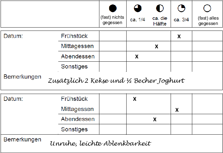 Die verzehrte Nahrungsmenge lässt sich mit einfachen Tellerprotokollen schnell und einfach erheben. Über mehrere Mahlzeiten und Tage wird der verzehrte Anteil des Angebots in Viertelportionen eingeschätzt, um so einen groben Überblick über die Essmenge und das Ausmass möglicher Defizite zu gewinnen (Abbildung 2). Ebenso wichtig ist es, bestimmte Gewohnheiten, Bedürfnisse, Vorlieben und Abneigungen in Erfahrung zu bringen, die häufig auch durch die Biografie geprägt sind und Ansatzpunkte für ein individualisiertes Essensangebot liefern, das Akzeptanz findet.
