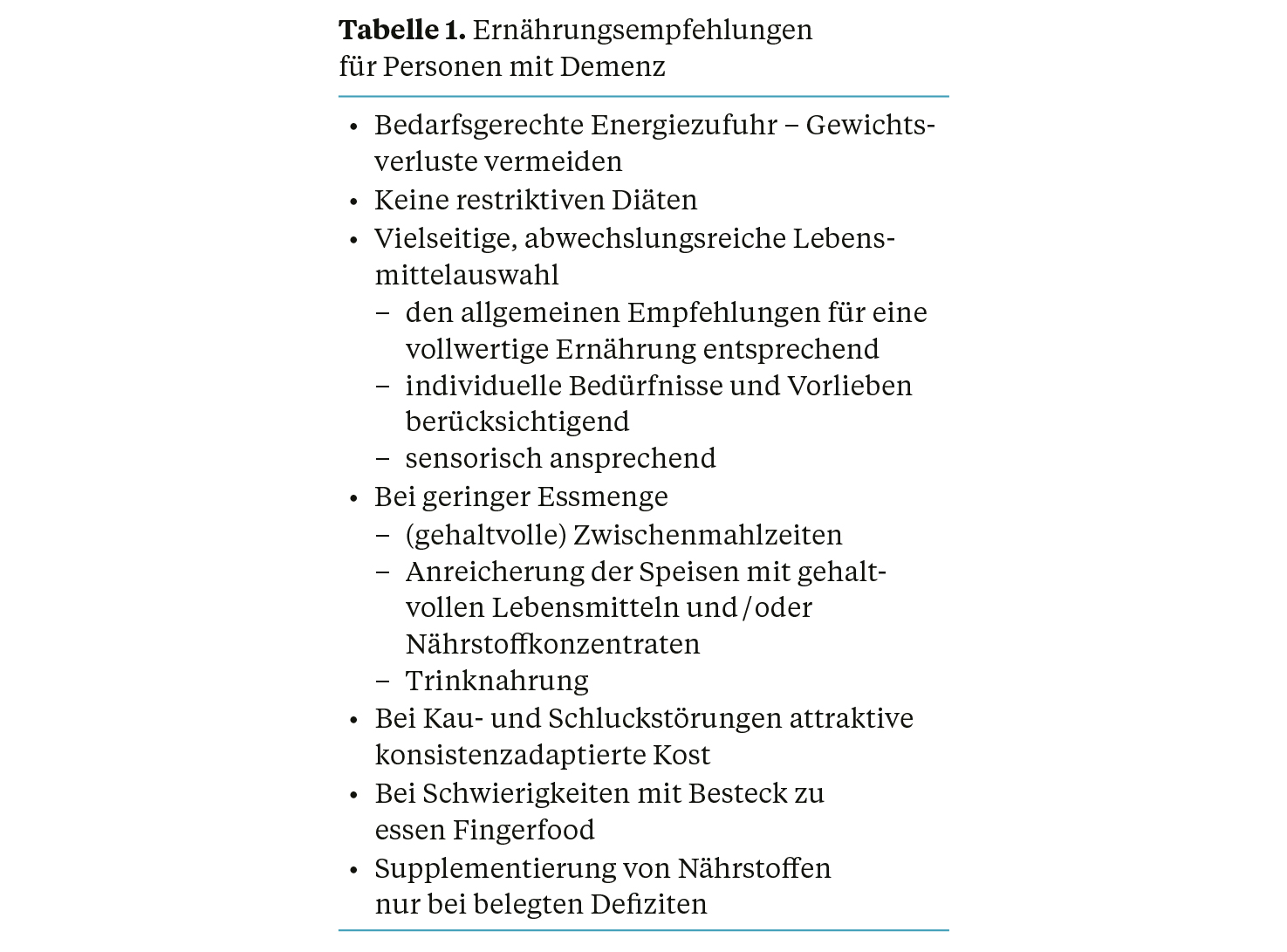 Die wichtigsten Ernährungsempfehlungen für Personen mit Demenz sind in Tabelle 1 zusammengefasst.