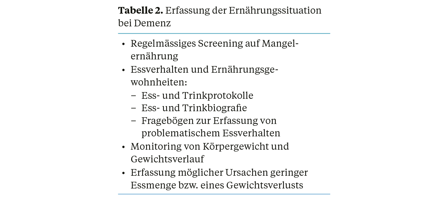 Der erste Schritt für sinnvolle Interventionsmassnahmen ist die detaillierte Erfassung der Ernährungssituation (Tabelle 2). Wie ist der Ernährungszustand? Welche Schwierigkeiten gibt es beim Essen und Trinken? Welche Vorlieben und Bedürfnisse hat die betroffene Person? Dabei ist generell zu bedenken, dass Menschen mit Demenz in ihrer Wahrnehmung und Mitteilungsfähigkeit mehr oder weniger eingeschränkt sind und daher meist Angehörige und Pflegepersonen als wichtige Informationsquelle hinzugezogen werden müssen.