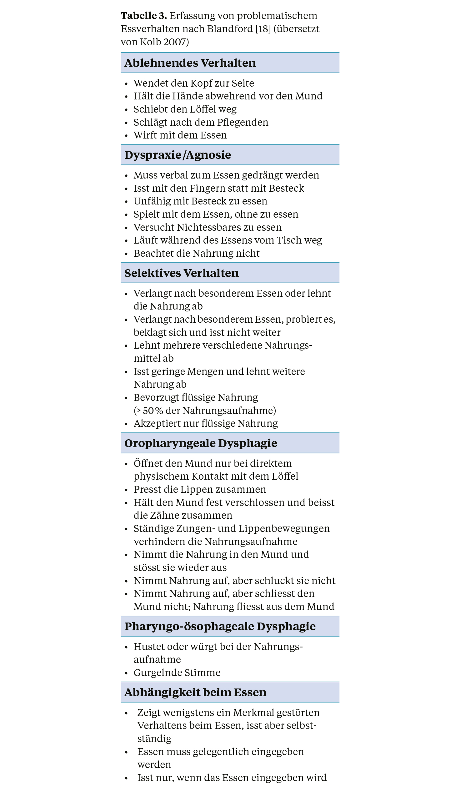 Neben der Befragung der Betroffenen und ihrer Angehörigen kann im institutionellen Umfeld eine aufmerksame Beobachtung der Mahlzeiteneinnahme aufschlussreich sein, um Schwierigkeiten beim Essen und Trinken, aber auch Gewohnheiten, Vorlieben und individuelle Bedürfnisse unmittelbar zu erkennen. Problematisches Essverhalten demenz-kranker Menschen kann im Rahmen des Assessments mit standardisierten Fragebögen differenziert erfasst werden, um daraus gezielte Unterstützungsangebote ableiten zu können. Tabelle 3 zeigt beispielhaft die deutsche Übersetzung der Blandford Scale [18].