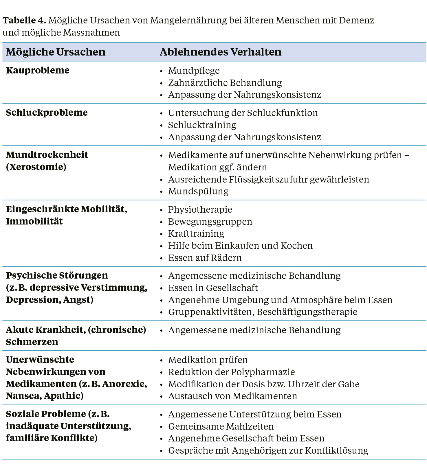 Bei geringer Essmenge und einem unbeabsichtigten Gewichtsverlust müssen die zugrunde liegenden Ursachen, die im Rahmen des Assessments neben den unmittelbaren Ernährungsaspekten ebenfalls systematisch erfasst wurden, weitestgehend beseitigt werden.