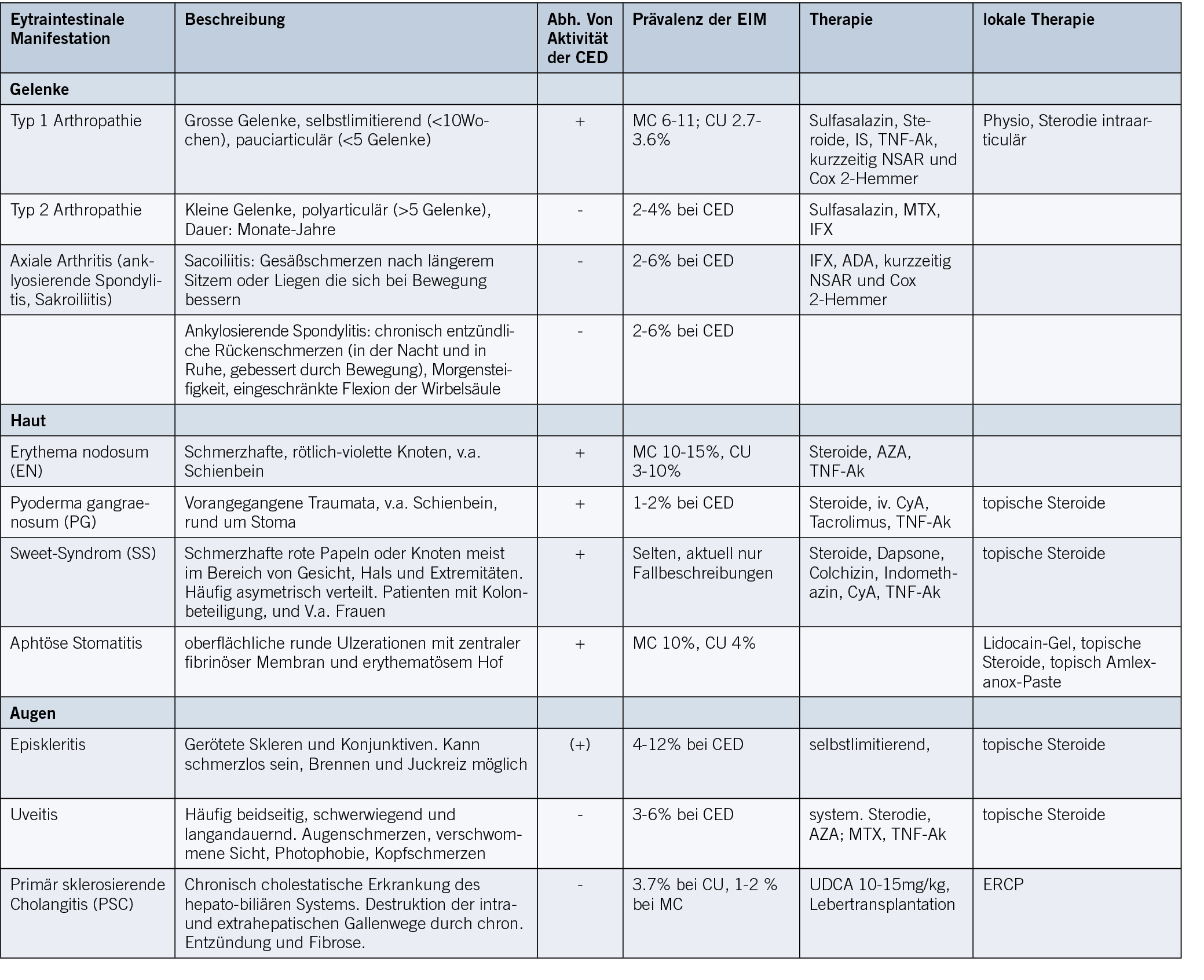 Bei den CED können neben dem Gastrointestinaltrakt auch andere Organsysteme befallen sein. Diese Manifestationen werden dann extraintestinale Manifestation (EIM) genannt und machen die CED zu einer Systemkrankheit. Die häufigsten EIM beinhalten rheumatologische (zum Beispiel axiale Arthropathie, periphere Arthropathie), ophthalmologische (Uveitis, Episkleritis), dermatologische (Erythema nodosum und Pyoderma gangraenosum) und hepatobiliäre Erkrankungen (primär sklerosierende Cholangitis). Es können prinzipiell jedoch alle Organsysteme betroffen sein. Die EIM werden bei 6 bis 47 Prozent der Patientinnen und Patienten mit CED beschrieben. Das Auftreten von EIM kann wesentlich zur Morbidität und Mortalität bei Personen mit CED beitragen [4–7]. Eine Zusammenfassung der wichtigsten EIM, der Prävalenz und der (lokalen) Therapien findet sich in Tabelle 1.