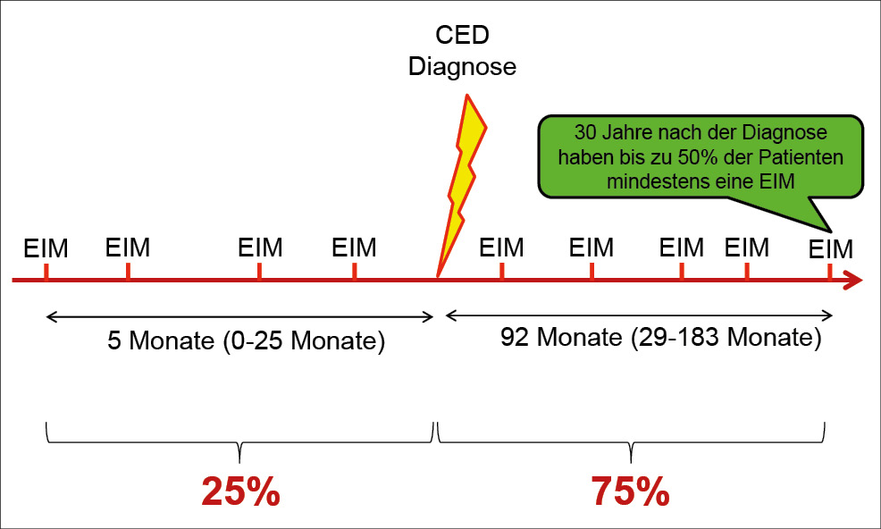 Die Diagnosen Morbus Crohn und Colitis ulcerosa werden in der Schweiz leider immer noch viel zu spät gestellt. In einer in der Schweiz durchgeführten Studie – der sogenannten «Schweizerischen IBD Kohortenstudie» – wurde die diagnostische Verzögerung bei Morbus-Crohn- und Colitis-ulcerosa-Patientinnen und -Patienten untersucht [8]. Im Durchschnitt vergehen zwischen dem Auftreten der ersten Symptome bis zur Diagnose der Krankheit beim Morbus Crohn neun Monate und bei der Colitis ulcerosa vier Monate. Die Diagnose der Colitis ulcerosa erfolgt schneller, da diese sich initial häufiger mit dem Alarmsymptom Blut im Stuhl präsentiert. Morbus-Crohn-Patientinnen und -Patienten auf der anderen Seite klagen eher über abdominale Schmerzen und Durchfälle. Die verzögerte Diagnosestellung kann aber auch sehr lang sein. Bei einem Viertel der Personen mit Morbus Crohn dauert es über 24 Monate bis zur Diagnose und bei einem Viertel der Colitis-ulcerosa-Betroffenen mehr als 12 Monate. Die verzögerte Diagnosestellung kann relevant sein. In einer Studie der Schweizerischen IBD-Kohorte konnte nämlich gezeigt werden, dass bei Patientinnen und Patienten mit einer verzögerten Diagnosestellung häufiger Komplikationen im weiteren Verlauf auftreten können [9]. Diese diagnostische Verzögerung von CED ist auch deshalb wichtig, weil sich teilweise bereits vor der Diagnose der CED EIM zeigen können (Abbildung 1). So können bei einem Viertel der Patientinnen und Patienten bereits mehrere EIM auftreten, bevor die Diagnose der CED gestellt wird [10]. Deshalb ist es wichtig, dass bei Auftreten solcher Manifestationen in der hausärztlichen, aber auch in der dermatologischen, ophthalmologischen und rheumatologischen Praxis an die Differenzialdiagnosen eines Morbus Crohn oder einer Colitis ulcerosa gedacht wird. Dies insbesondere bei gleichzeitigem Auftreten von Durchfällen oder abdominellen Schmerzen mit der EIM.