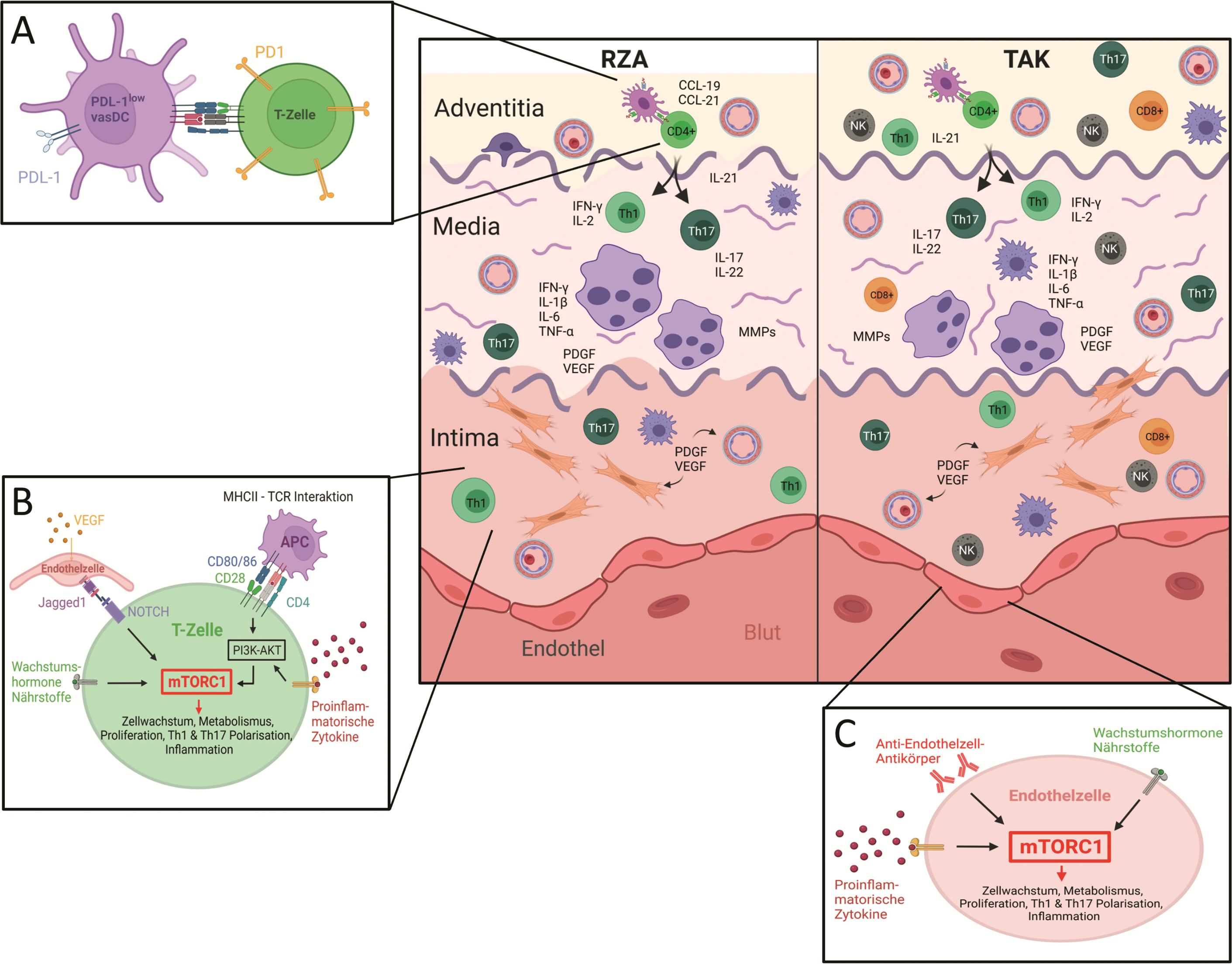 mTORC1-Hyperaktivität: Ein weiterer wichtiger Schlüsselmechanismus in der Pathogenese der RZA und der TAK ist der mTORC1(«mechanistic Target of Rapamycin Complex 1»)-Signalweg. mTORC1 ist ein entscheidender Regulator von Zellwachstum, Zellmetabolismus und Zelltod. Bei beiden Erkrankungen kommt es zu einer Hyperaktivierung von mTORC1, was zu einer Vermehrung von Endothelzellen, zur erhöhten Freisetzung von entzündungsfördernden Zytokinen, zur Förderung der CD4+-T-Zellproliferation in Richtung Th1- und Th17-Zellen und zur Beeinträchtigung der Treg-Zellfunktion führt [28]. Bei der RZA wird die vermehrte mTORC1-Aktivität durch zwei dysfunktionale Upstream-Mechanismen verursacht. Erhöhte VEGF-Werte führen zu einer verstärkten Expression des NOTCH1-Ligand Jagged1 auf Endothelzellen der Vasa vasora. Die Interaktion zwischen Jagged1+-Endothelzellen und NOTCH1+-T-Zellen, führt zur Aktivierung von mTORC1 in den T-Zellen [29]. mTORC1 wird ebenfalls durch eine vermehrte Aktivität des CD28-PI3K-AKT-Signalweges verursacht [30]. Bei der TAK wurden diese beiden Signale bis anhin nicht untersucht, jedoch konnten Hadjadj et al. zeigen, dass es durch die Bindung von IgG-Antikörpern an Endothelzellen zu einer vermehrten mTORC1-Aktivierung kommt [31]. Auch T-Zellen weisen bei der TAK eine vermehrte mTORC1-Aktivität auf, die verantwortlichen Mechanismen sind noch nicht untersucht [28].