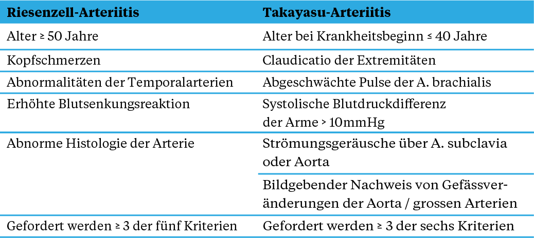 Gemäss der Chapel-Hill-Nomenklatur von 2012 werden die beiden idiopathischen Vaskulitisformen Riesenzellarteriitis (RZA) und Takayasu-Arteriitis (TAK) als Grossgefässvaskulitiden zusammengefasst [1]. Die RZA, auch Morbus Horton, Arteriitis temporalis oder kraniale Arteriitis genannt, ist die häufigste primäre Vaskulitisform des erwachsenen Menschen jenseits des 50. Lebensjahres. Weltweit beträgt die jährliche Inzidenz 1,6 bis 32,8 Fälle / 100 000 und erreicht typischerweise ihren Höhepunkt in der siebten bis achten Lebensdekade [2, 3]. 40 bis 60 Prozent der RZA-Patientinnen und -patienten weisen zusätzlich eine Polymyalgia rheumatica (PMR) auf. Obschon eine gleichzeitige RZA bei Vorliegen einer PMR seltener vorkommt (16 bis 29 Prozent), sollte diese bei Therapieresistenz, auch bei fehlender Klinik, gesucht werden [4, 5]. Die TAK ist mit einer jährlichen Inzidenz von 0,3 bis 2,2 Fälle / 100 000 weitaus seltener und beginnt meist in der Adoleszenz oder im frühen Erwachsenenalter [6, 7]. Eine TAK kommt in der Kindheit weniger häufig vor. Dennoch können in ca. einem Drittel der Fälle die ersten Symptome in die Kindheit rückdatiert werden [8]. Sowohl die TAK wie auch die RZA sind primär Erkrankungen des weiblichen Geschlechtes mit einem Frauen-zu-Männer-Verhältnis von ca. 9:1 bei der TAK und 3:1 bei der RZA [3, 7]. Lange Zeit galt die TAK typischerweise als Erkrankung asiatischer Frauen. Neuere epidemiologische Studien belegen jedoch, dass die TAK weltweit vorkommt und ein unterschiedliches Geschlechterverhältnis je nach Region aufweist [7]. Die RZA tritt ebenfalls weltweit auf, betrifft jedoch häufiger Personen kaukasischer Herkunft, insbesondere diejenigen mit skandinavischen Vorfahren [7]. In Tabelle 1 sind die «American College of Rheumatology (ACR)»-Klassifikationskriterien der RZA und der TAK von 1990 aufgelistet. Kürzlich wurden neue ACR-Klassifikationskriterien ausgearbeitet, die 2022 publiziert wurden. Wichtig ist, dass diese Kriterien primär für eine Klassifikation (zum Beispiel in Studien) und nicht als Diagnosekriterien erstellt wurden.