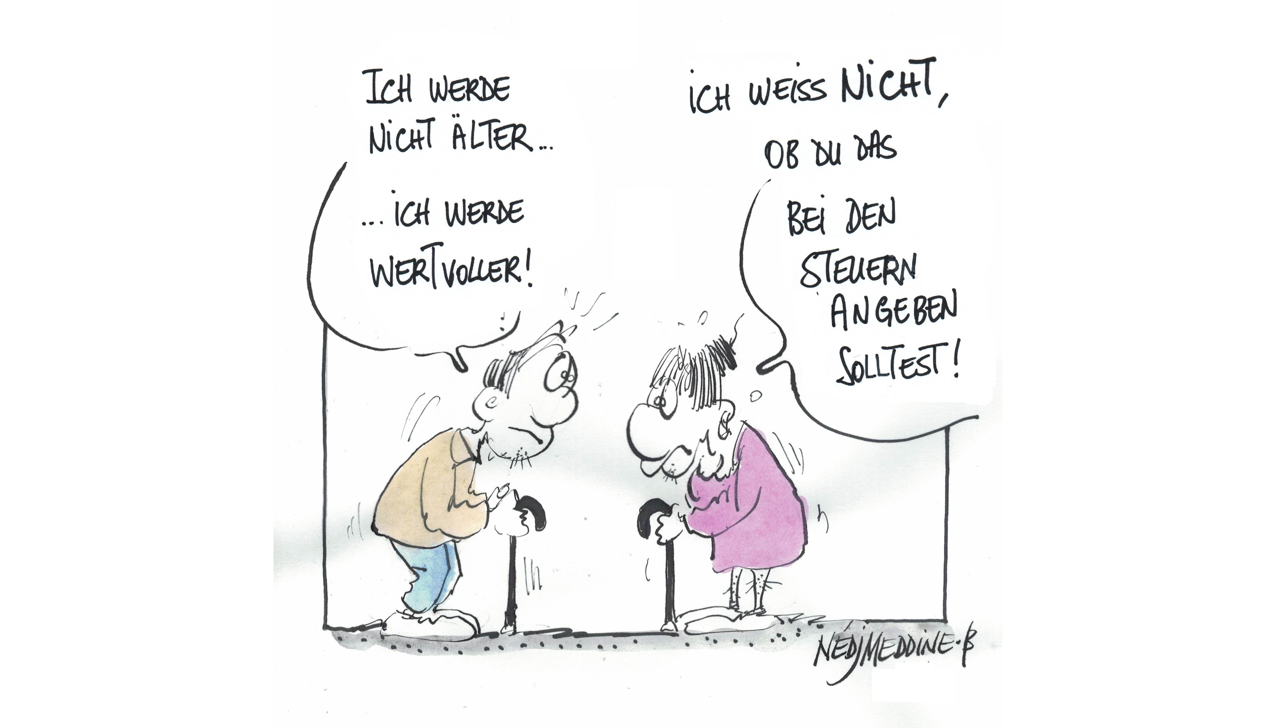 In einer Abteilung höre ich ein älteres Ehepaar diskutieren. Offensichtlich hat der Mann Mühe, das Älterwerden zu akzeptieren. Er sagt: «Ich werde nicht älter, ich werde wertvoller!» Die Frau antwortet: «Ich weiss nicht, ob du das bei den Steuern angeben solltest.»