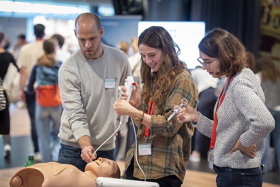 Einige Fragen hatten die Medizinstudierenden auch an die zahlreichen Vertreterinnen und Vertreter von Spitälern, Fachgesellschaften und weiteren Organisationen, die in der Ausstellung Give-aways verteilten, Aktivitäten wie die Simulation einer Laparoskopie oder einer Nasenendoskopie begleiteten und vor allem: Auskunft gaben. «Reichen meine Sprachkenntnisse für eine Tätigkeit in Freiburg?», war eine der dominierenden Fragen am Stand des Freiburger Spitals HFR. «Welches ist die beste Strategie, um eine der wenigen Stellen in der Oto-Rhino-Laryngologie zu erhalten?», wollten einige Studierende von den Vertretern dieser Fachgesellschaft wissen. «Ist eine gute Work-Life-Balance in der Chirurgie möglich?», «Wie kompetitiv ist das Klima?» und «Ist es für Frauen schwieriger, in der Chirurgie Fuss zu fassen?», waren häufige Fragen am Stand des Swiss College Of Surgeons.