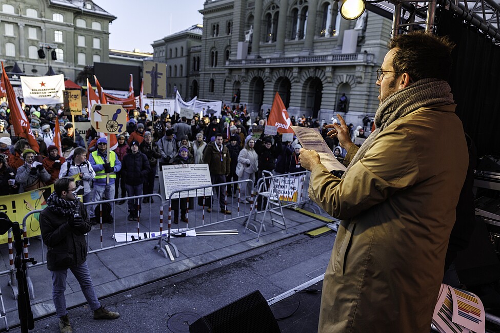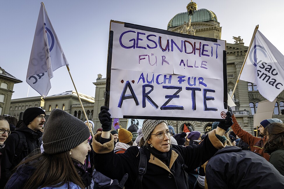 «Das schweizerische Gesundheitswesen befindet sich am Anschlag; man könnte auch sagen: Der Patient hat Kammerflimmern!» So begann vsao-Präsident Severin Baerlocher am Samstag, 22. November – am Nachmittag der vsao-Zentralvorstandssitzung – seine Rede. Seinen Worten lauschten jedoch nicht nur Mitglieder des Zentralvorstands (ZV), sondern über 5000 Personen aus der Ärzteschaft, Pflege und anderen Bereichen. Sie alle waren trotz eisiger Temperaturen an diesem Nachmittag mit Fahnen und beschrifteten Papptafeln zusammengekommen, um vor dem Bundeshaus für eine sichere Gesundheitsversorgung und bessere Arbeitsbedingungen zu demonstrieren.