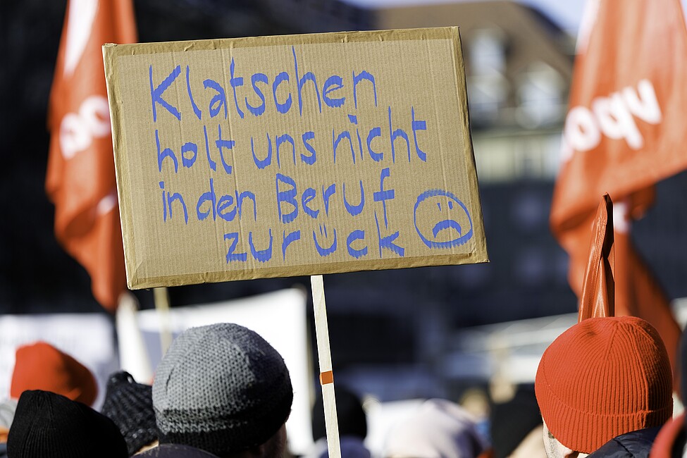 Die Demonstrierenden riefen den Bundesrat und das Parlament dazu auf, das Problem ernst zu nehmen und endlich zu handeln – unter anderem mit der Verbesserung des bundesrätlichen Vorschlags für die zweite Umsetzungsetappe der Pflegeinitiative. Diese sollte ursprünglich in der Wintersession ins Parlament kommen, wurde aber vertagt. Ebenfalls appellierten die Teilnehmenden an kantonale Behörden und Arbeitgebende, den Spardruck nicht auf dem Rücken der Angestellten auszutragen und den ohnehin bestehenden Fachkräftemangel nicht mit unzumutbaren Arbeitsbedingungen zu verschärfen. In diesem Rahmen brachte Severin Baerlocher auch die Forderungen an, für die sich der vsao seit Langem einsetzt: die Einhaltung des Arbeitsgesetzes, die Ausbildung von genügend Nachwuchs und die Vereinbarkeit. «Nur wenn neben unserer Arbeit Zeit für ein Leben bleibt, um die stark beanspruchten Batterien durch Freizeit oder gemeinsam mit der Familie wieder aufzuladen, können wir dafür sorgen, dass wir bis zur Pensionierung in unserem schönen und herausfordernden Beruf verbleiben können.»