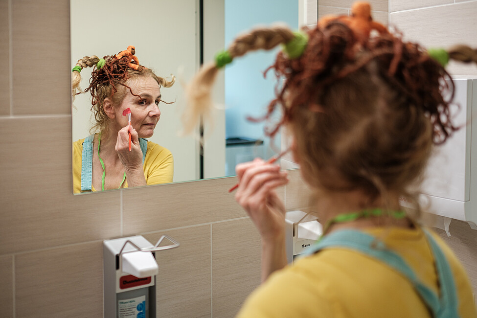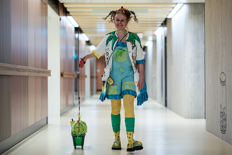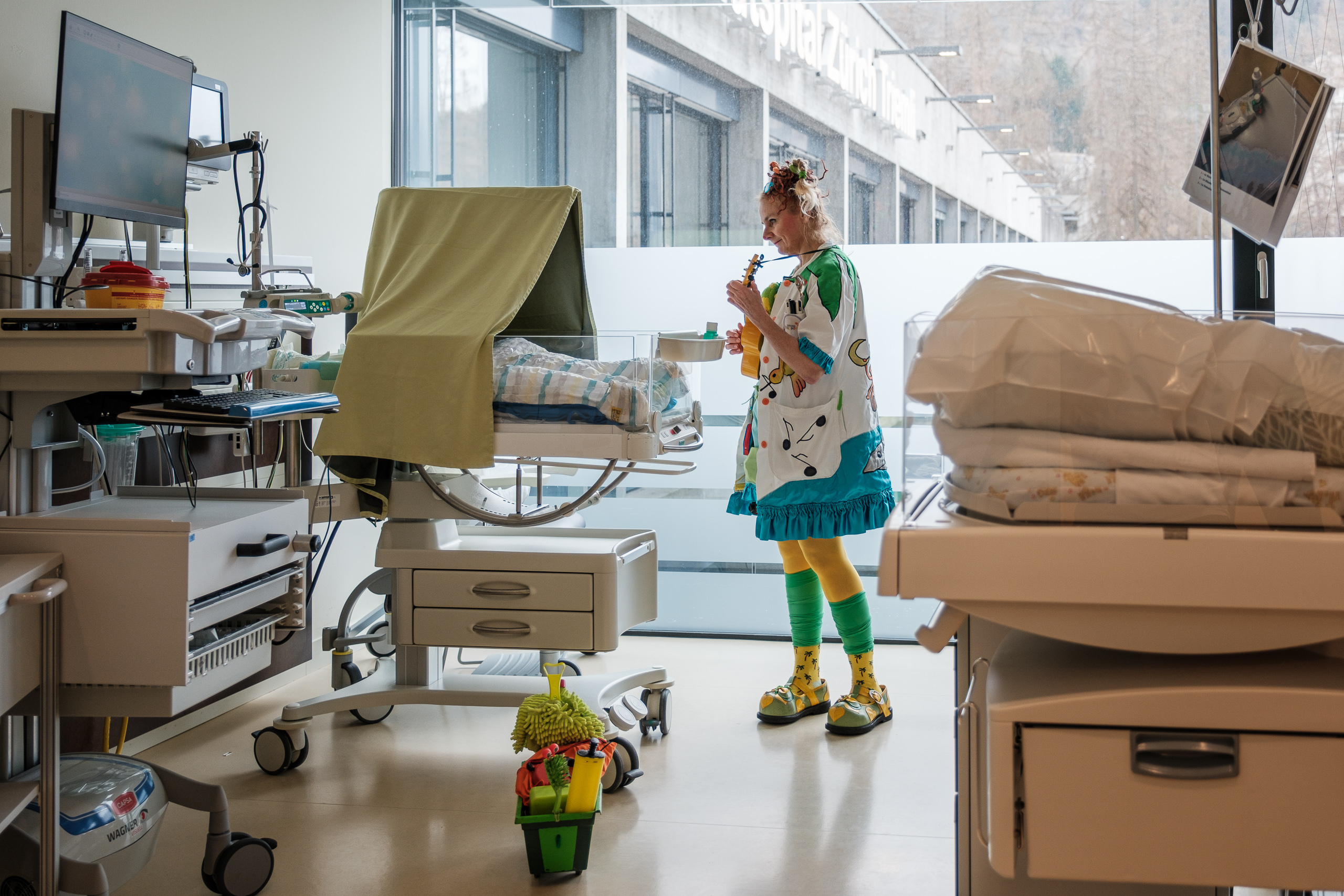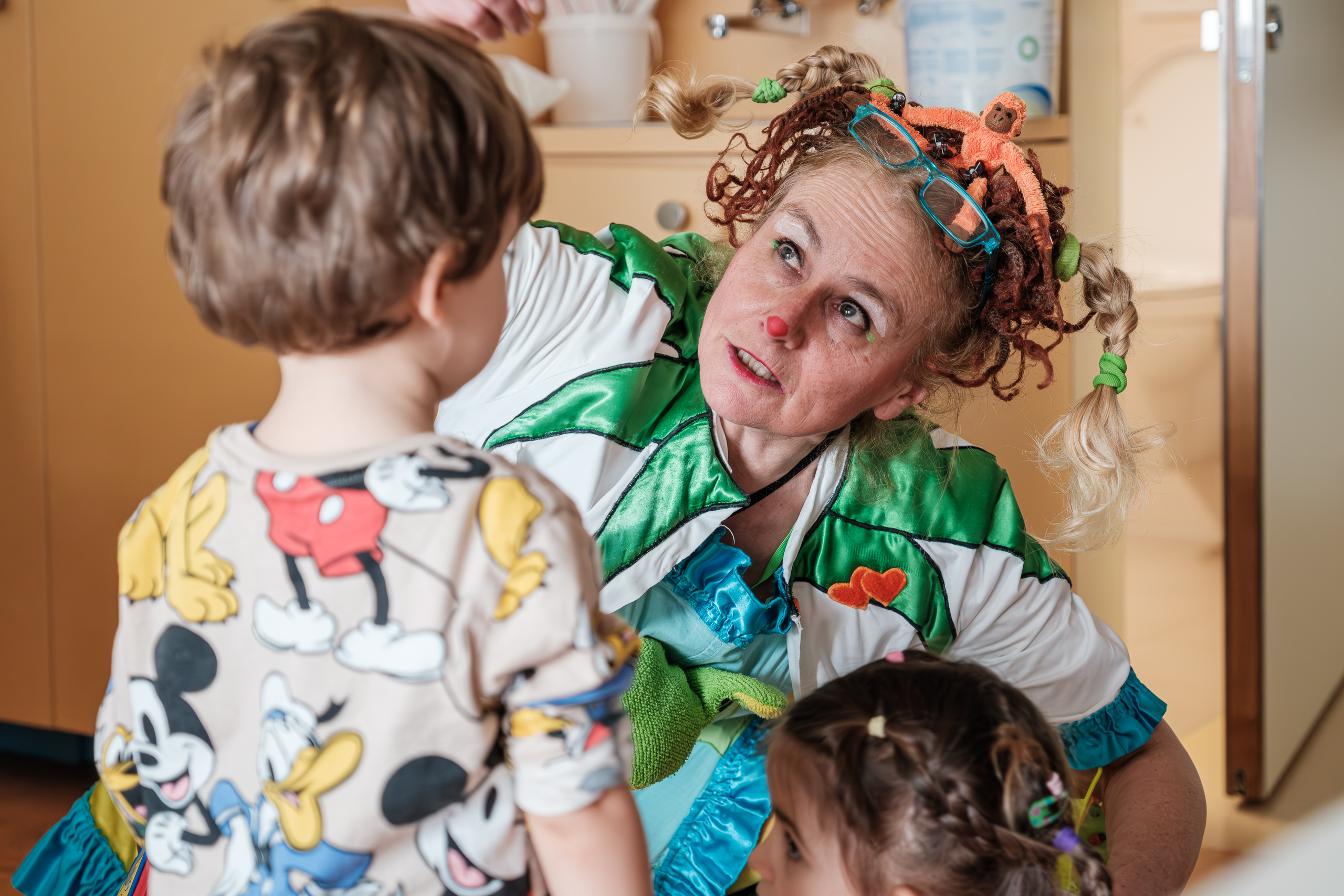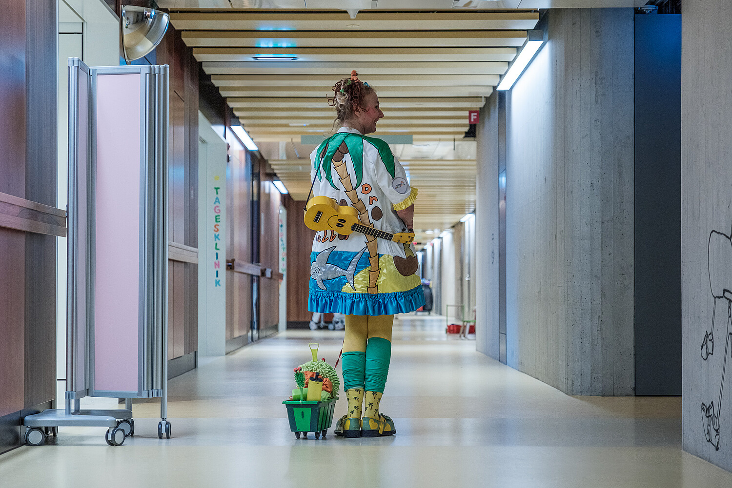 La Docteure Cocobella commence toujours sa visite par la néonatologie. Là, les sons doux sont de mise: accompagnée de son ukulélé, elle fredonne des chansons à chaque nouveau-né, ce qui a souvent aussi un effet apaisant sur les parents. Avec les enfants plus grands, elle fait des tours de magie, des sculptures de ballons, des bulles de savon, chahute et cherche le dialogue avec les jeunes patientes et patients. Avec les adolescents en particulier, elle privilégie généralement la discussion aux pitreries. «J’essaie toujours de placer l’enfant au centre et non la maladie. Il doit pouvoir oublier qu’il est à l’hôpital – même si ce n’est que pour un instant.» Elle constate régulièrement l’efficacité de cette diversion lorsqu’elle travaille avec les médecins et le personnel soignant. Ceux-ci sont généralement heureux de pouvoir effectuer des tâches désagréables, comme une prise de sang, en présence de la Docteure Cocobella. Si elle dispose d’un peu de temps pour gagner la confiance de l’enfant, elle parvient généralement à le mettre à l’aise et à le détourner de ses craintes.