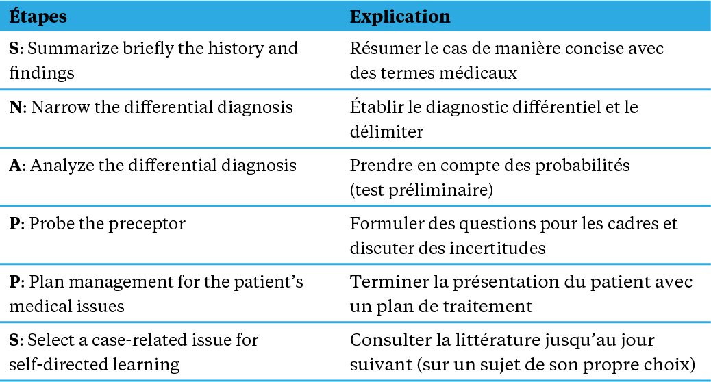 SNAPPS: Pour «SNAPPS», les médecins-assistant(e)s doivent disposer de certaines connaissances sur le déroulement de ce modèle d’apprentissage; ce sont eux qui, contrairement au premier modèle, pilotent et déterminent le contenu de l’unité de formation postgraduée. Pour que le modèle fonctionne, il doit être connu du cabinet ou de la clinique et soutenu par les médecins cadres.