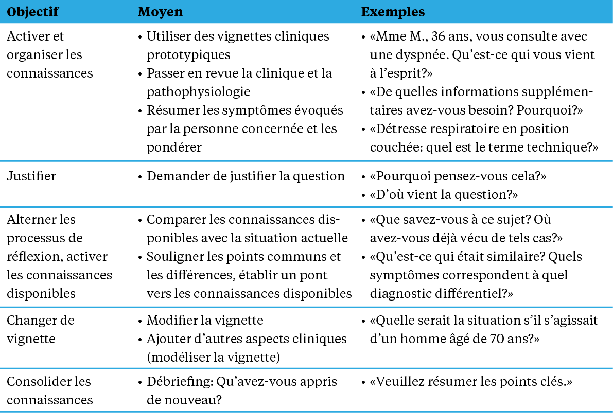 Le raisonnement clinique se fonde sur des théories d’apprentissage qui, par l’activation des propres connaissances, permettent de mémoriser de nouvelles informations. Ce dernier paragraphe montre dans quel domaine cela peut s’appliquer à l’enseignement [3, 4, 5]: notre mémoire est divisée (dual process theory) en une mémoire de travail et une mémoire à long terme. Nous comparons rapidement et intuitivement les situations que nous connaissons, parce que nous les avons déjà apprises une fois, avec les connaissances correspondantes dans notre mémoire à long terme (pattern recognition). Cependant, si nous rencontrons une nouvelle situation, nous lançons des processus de réflexion analytiques. Nous traitons les informations disponibles, établissons des hypothèses, cherchons de nouvelles informations, rejetons des hypothèses – jusqu’à ce que nous obtenions un diagnostic et une thérapie appropriés (raisonnement hypothético-déductif). Ces deux processus sont complémentaires dans notre quotidien. Le tableau 3 montre comment nous pouvons nous entraîner au second et le combiner avec le premier.