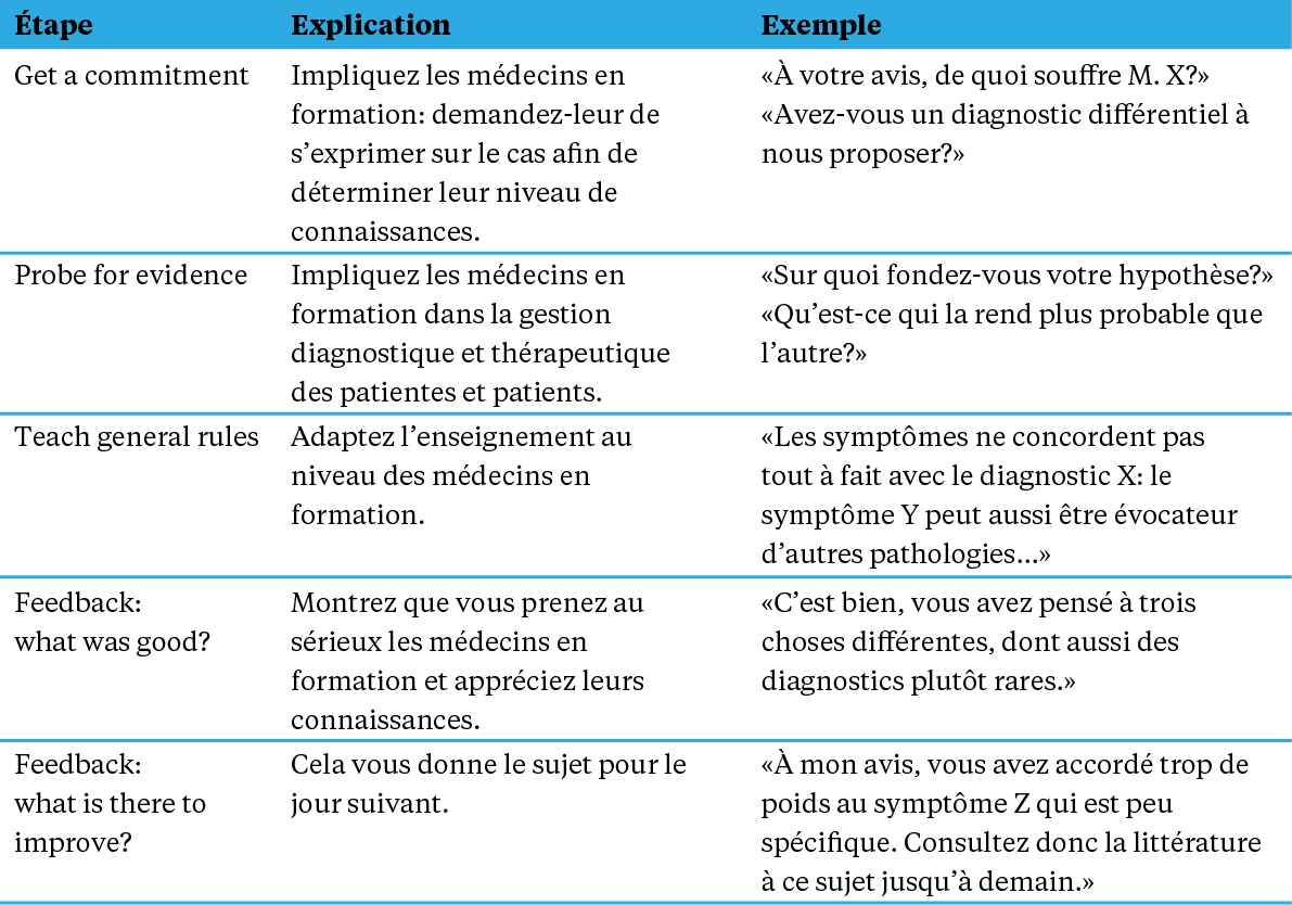 L’enseignement au quotidien en clinique dépasse le simple enseignement de connaissances médicales, car la manière de faire est aussi importante que le contenu. L’on peut également profiter de brèves séquences pour impliquer les médecins-assistant(e)s. Les conseils suivants vous montrent comment procéder: